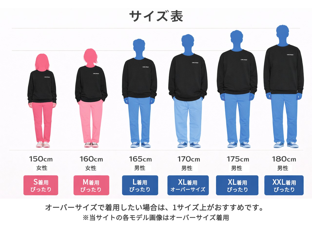 本商品は男女兼用(ユニセックス)サイズですが、オーバーサイズをおすすめしております。